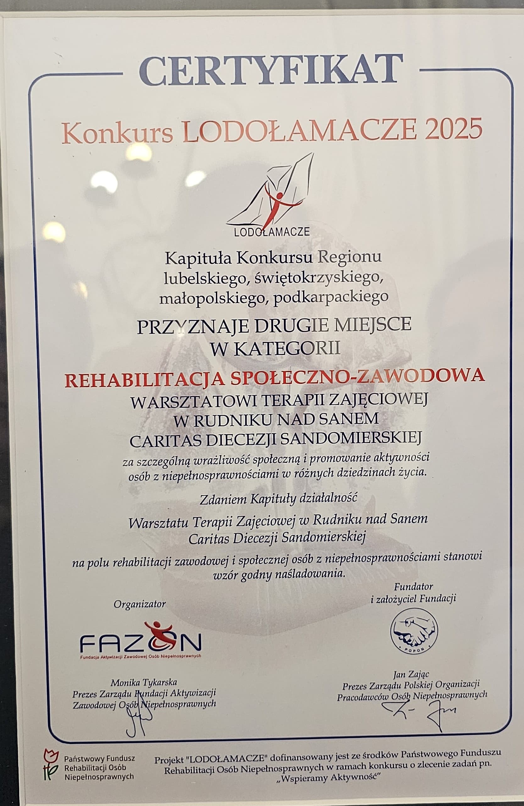 Kapituła Konkursu Regionu lubelskiego, świętokrzyskiego, małopolskiego, podkarpackiego przyznała Warsztatowi Terapii Zajęciowej w Rudniku nad Sanem, działającemu przy Caritas Diecezji Sandomierskiej II miejsce w kategorii rehabilitacja społeczno-zawodowa.